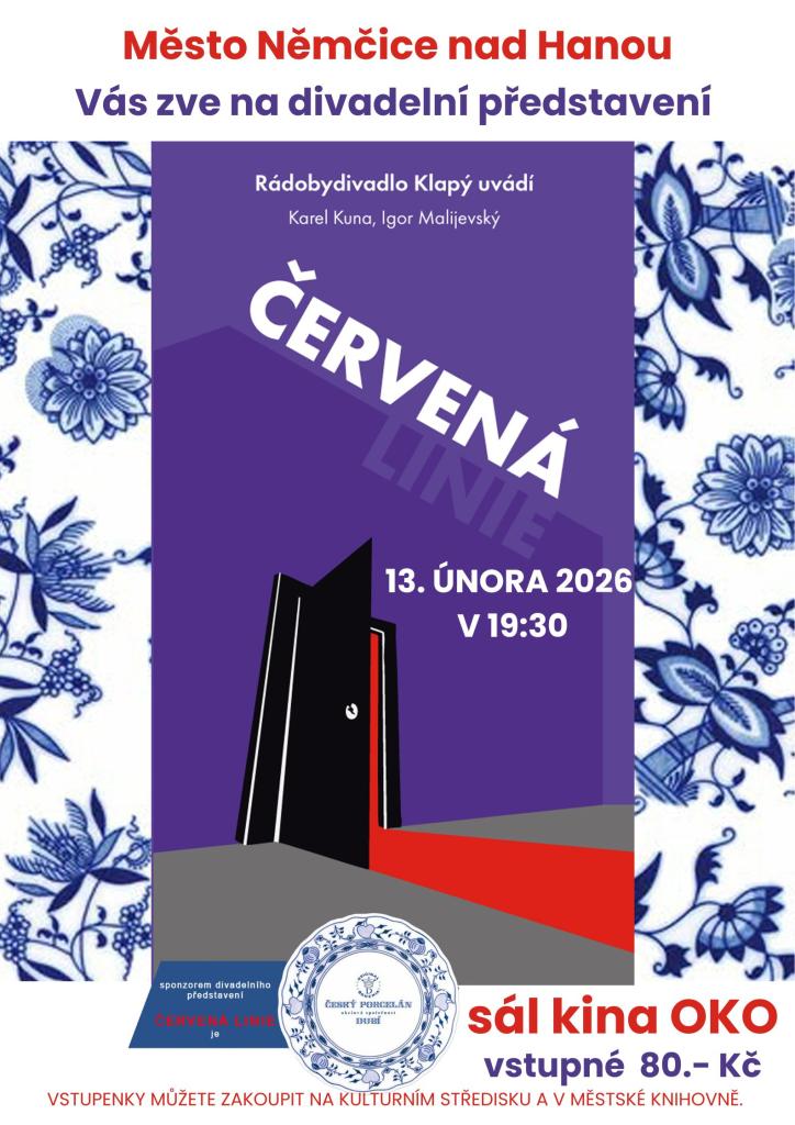 Město Němčice nad Hanou Vás srdečně zve na divadelní představení Červená linie Rádobydivadla Klapý. V hlavních rolích vystoupí Karel Kuna a Igor Malijevský. Akce se koná 13. února 2026 v 19:30 v sále kina OKO. Psychologické drama o rodinném setkání, které se vymkne kontrole. Vstupné je 80 Kč. Vstupenky lze zakoupit v kulturním středisku a také v městské knihovně.