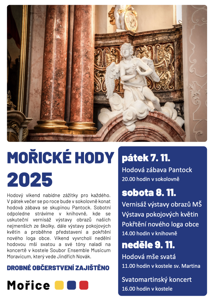 Hodový víkend v Mořicích přináší pestrou nabídku akcí. V pátek 7. listopadu začne hodová zábava s hudební skupinou Pantock v sokolovně ve 20:00 hodin. V sobotu 8. listopadu v 14:00 hodin proběhne vernisáž výstavy obrazů dětí z mateřské školy a výstava pokojových květin v místní knihovně. Tento den také dojde ke slavnostnímu pokřtění nového loga obce. V neděli 9. listopadu se v kostele sv. Martina uskuteční hodová mše svatá v 11:00 hodin a od 16:00 hodin Svatomartinský koncert, kde vystoupí Soubor Ensemble Musicum Moravicum pod vedením Jindřicha Nováka. V rámci celého víkendu bude zajištěno drobné občerstvení.